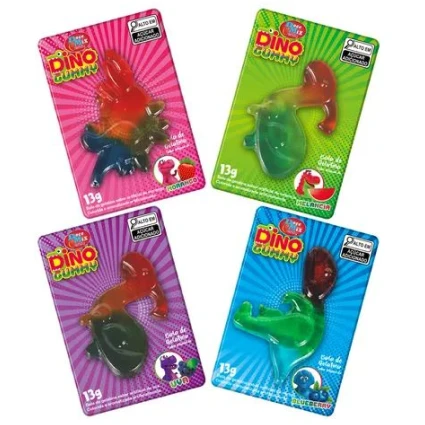 Formatos de Dinossauros: Balas modeladas como diferentes espécies de dinossauros, estimulando a imaginação e a brincadeira durante o consumo.