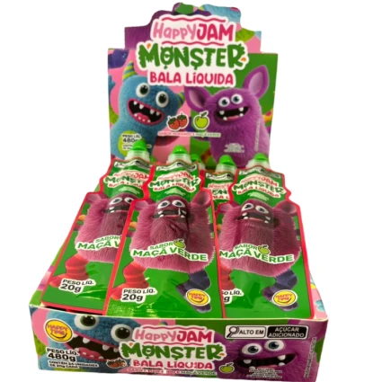 Leve uma explosão de sabor para a brincadeira com a Bala Líquida Happy Jam Monster da Happy Time! Projetada para ser o destaque de qualquer bomboniere, esta bala líquida combina embalagens colecionáveis com a intensidade dos sabores de morango e maçã verde.