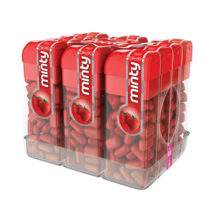 Design Atraente: A embalagem transparente destaca a cor vibrante das pastilhas, facilitando a identificação do sabor e tornando-a um item de destaque visual.