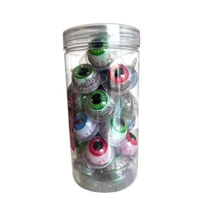 Visual Realista: Chicletes modelados em formato de olhos com detalhes de íris coloridas e “veias” vermelhas, criando um efeito visual impactante.