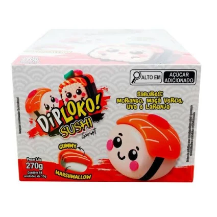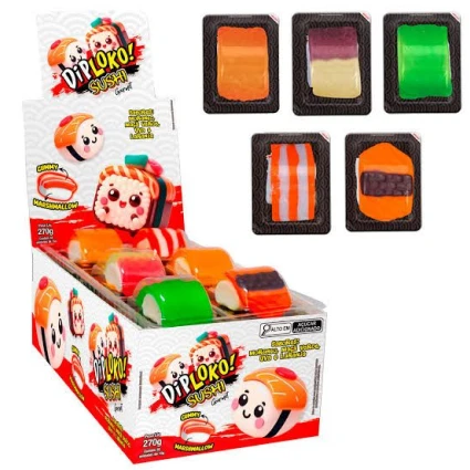 O Dip Loko Sushi Gummy traz a elegância da culinária japonesa em uma versão doce, lúdica e irresistível. Combinando a textura macia da gelatina (gummy) com a leveza do marshmallow, cada peça é uma explosão de sabor frutado que encanta os olhos e o paladar.