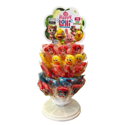 Deixe o dia mais alegre com a invasão de fofura do Pirulito Happy Lolli Tree Animals da Happy Time! Projetado para ser o centro das atenções, este produto une pirulitos modelados com um sistema de exposição vertical que encanta crianças e adultos.