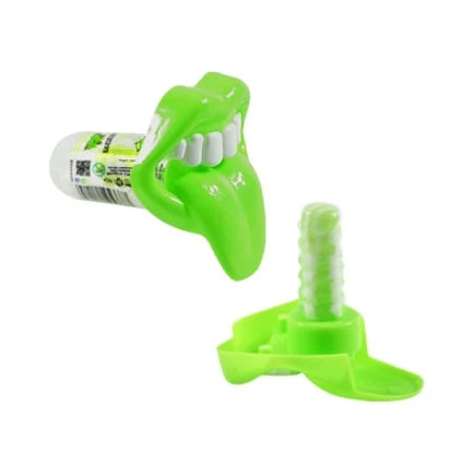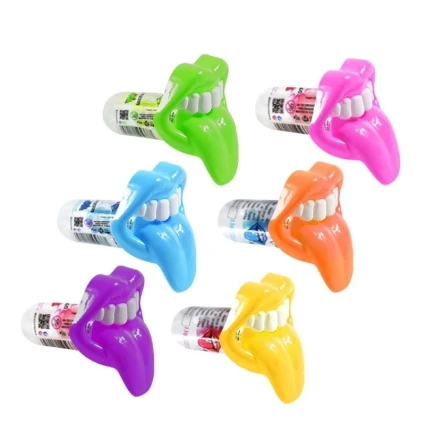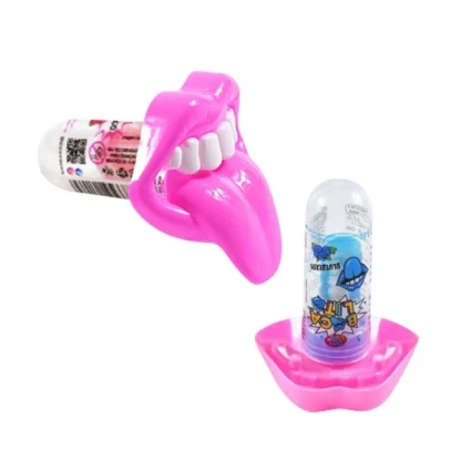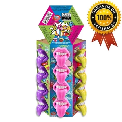 Design Interativo: Cada pirulito vem com uma capa plástica resistente em formato de boca com a língua para fora, permitindo que a criança brinque de fazer caretas enquanto consome o doce.