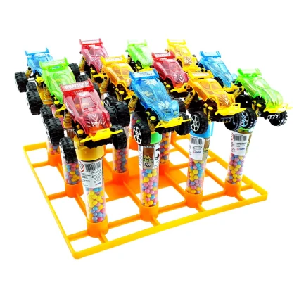 O Rally Toys é a combinação perfeita de velocidade e doçura. Cada unidade traz um carrinho de rally robusto com sistema de fricção, montado sobre um tubo repleto de pastilhas coloridas e crocantes, garantindo entretenimento completo para os pequenos pilotos.