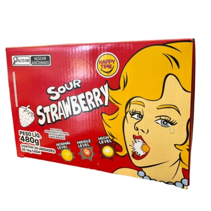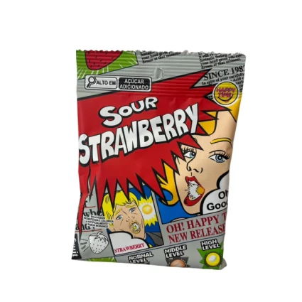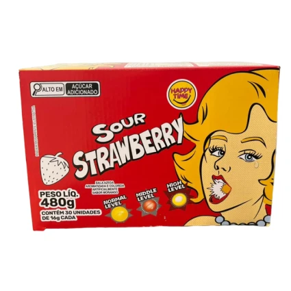 Prepare-se para uma explosão de sabor com a Bala Sour Strawberry da Happy Time! Este doce desafia os limites da acidez tradicional, unindo o sabor artificial de morango a uma cobertura extremamente azeda que escala em intensidade.